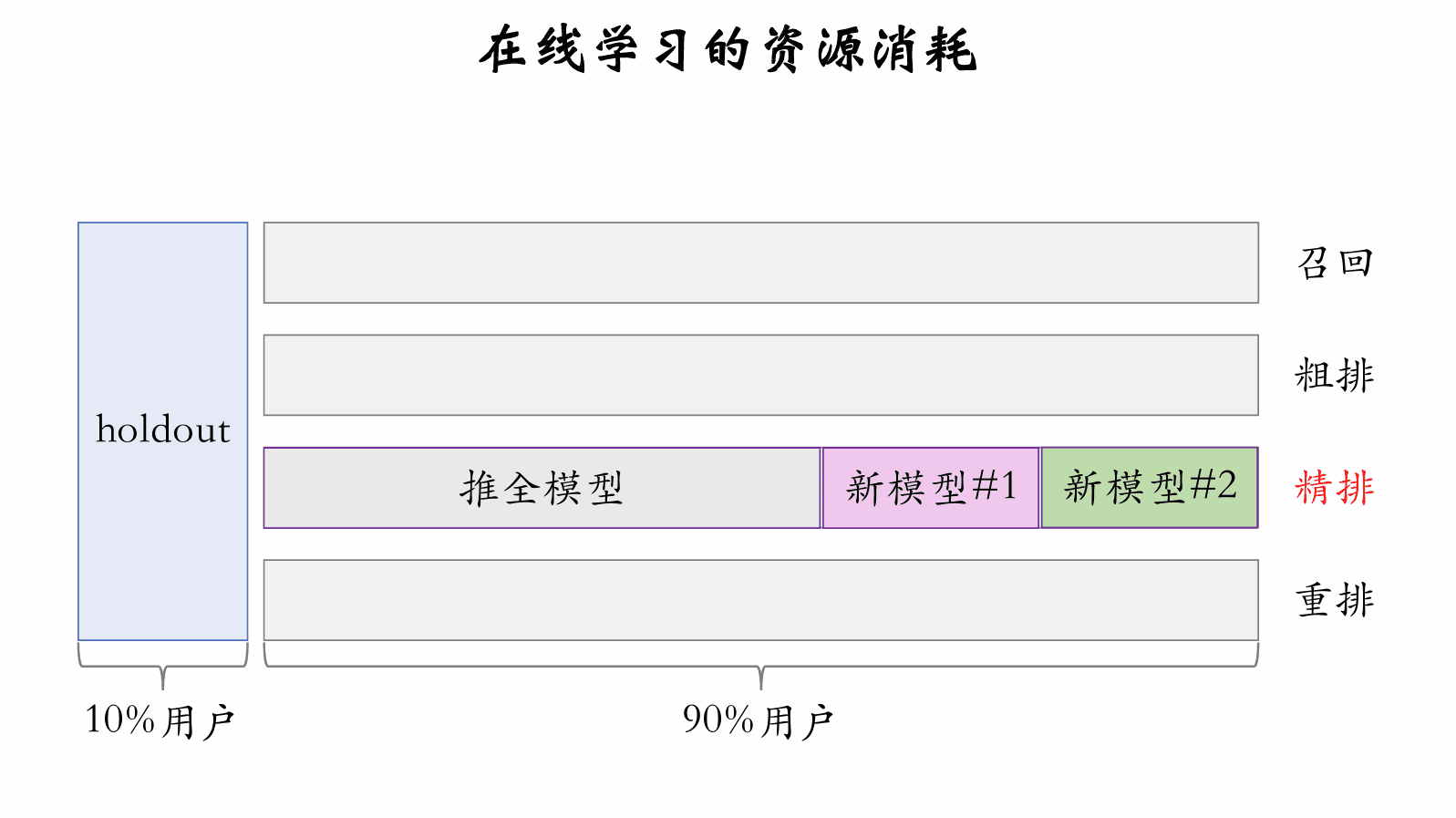 • 每个用户人群使用一个排序模型,推荐系统同时维护多个大模型。